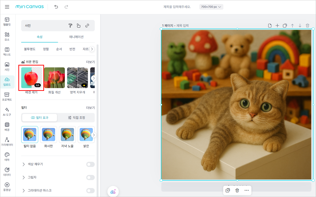 1. 먼저 미리캔버스에 접속하여 사진을 업로드해줍니다. 그리고 배경 제거 버튼을 클릭합니다. 5~10초 정도가 지나면 완료됩니다.