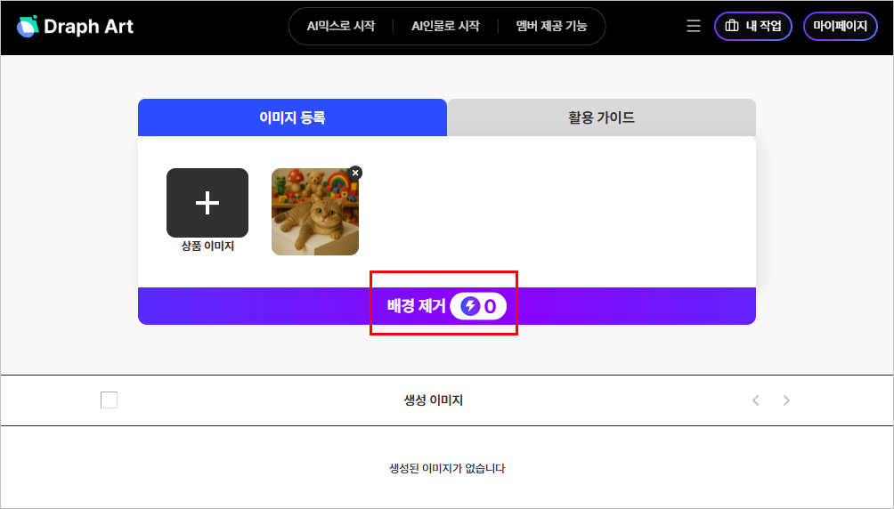 3. 이미지 등록 후 [배경 제거] 버튼을 클릭합니다. 소요되는 크레딧을 없습니다. 무료로 배경제거 기능을 사용할 수 있어요.