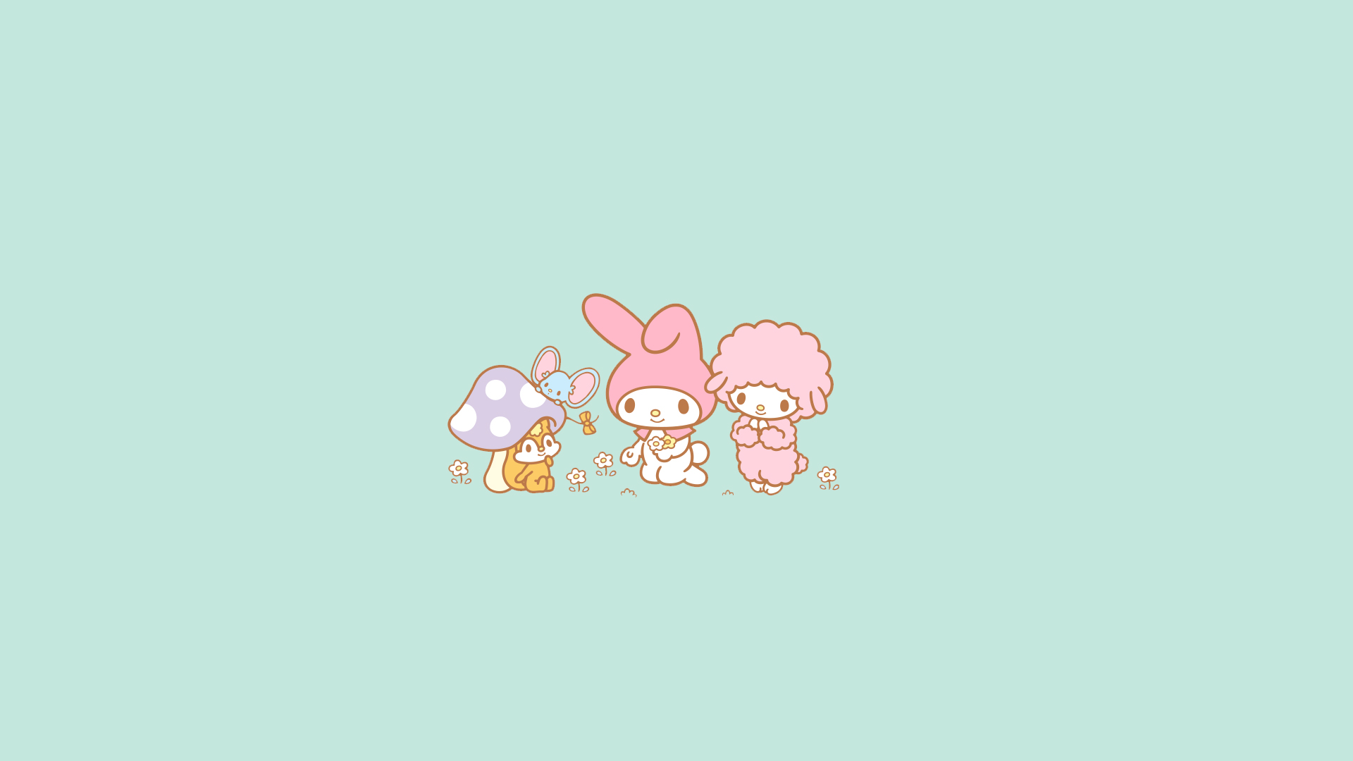 마이멜로디, 마이스윗피아노(양), 플랫(쥐), 다람쥐가 함께하는 배경화면 입니다.