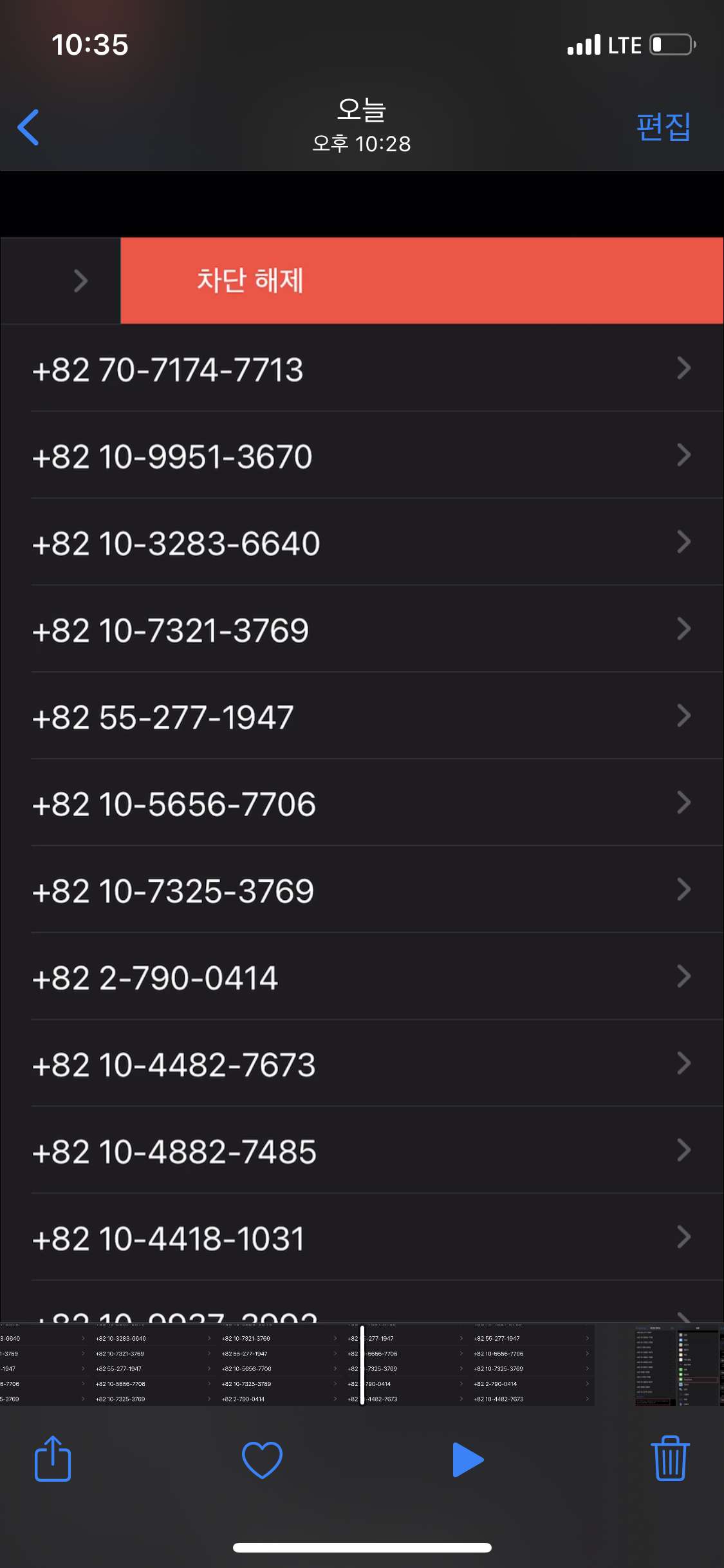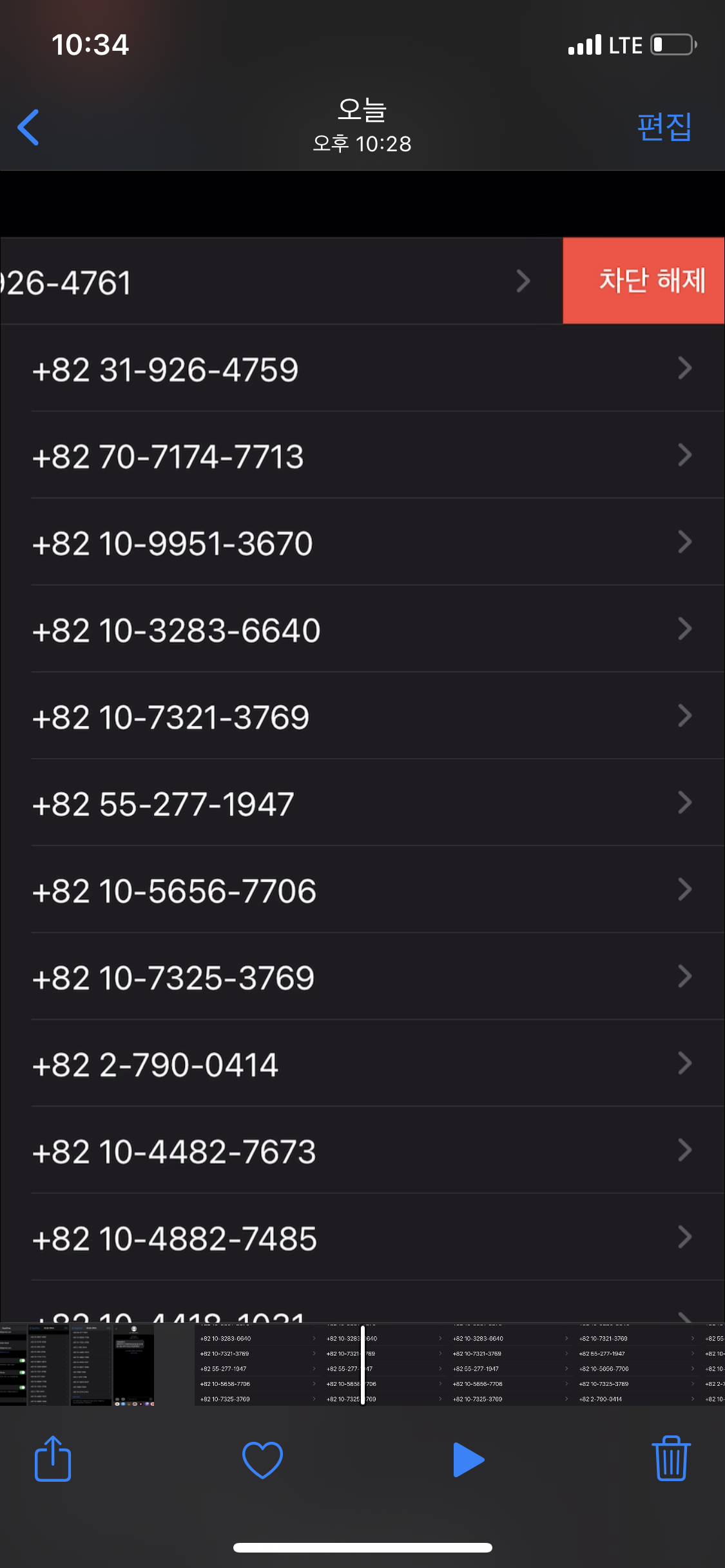 차단하고자 하는 번호를 왼쪽으로 스와이프하거나, 우측의 화살표 모양을 누르면 차단을 해체할 수 있습니다.